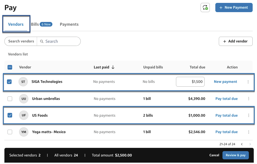 4- Check the box next to the vendors you want to pay. At the bottom of the page, you can see the total amount and number of vendors you're paying.