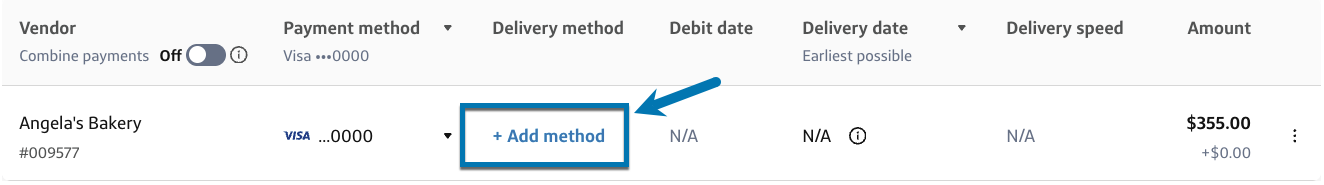 Ask a vendor to fill out their payment details if you don't know their delivery method by selecting + Add method.