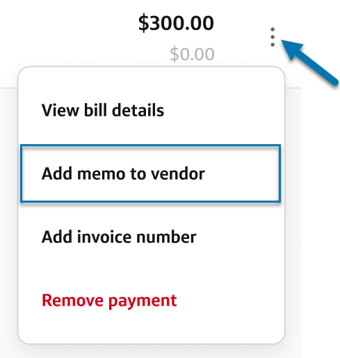 Add a memo to the vendor (optional): Select the three dots next to the amount and select Add memo to vendor from the dropdown list.
