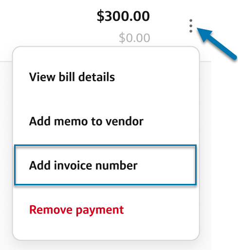 Adding invoice number (optional): When making a payment without a bill, if you have the invoice number it can be useful for reconciliation purposes. To add it, select the three dots and select Add invoice number.