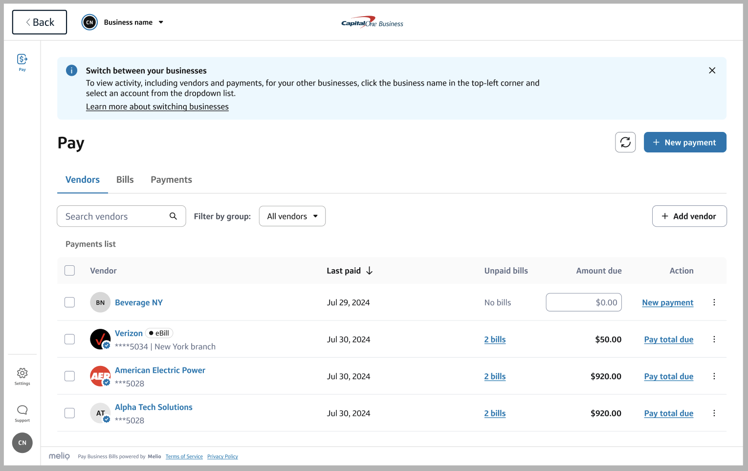 Pay business bills allows you to manage multiple businesses accessible from a central location. You can add additional businesses and easily switch between them. To learn more, please see the following guide.