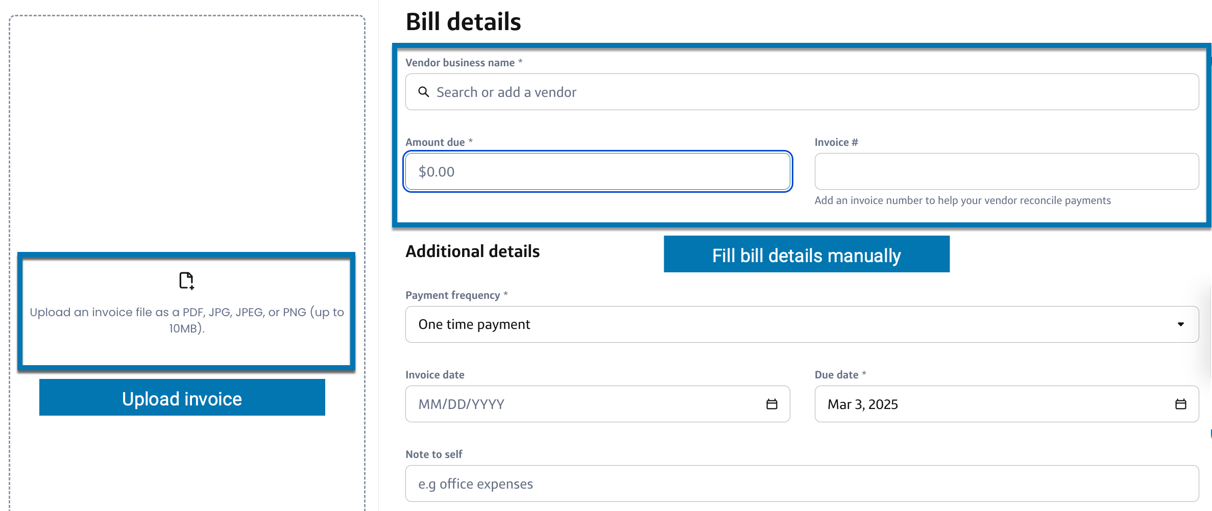 6- In the Bill details page, you can manually enter the bill details or upload an invoice.