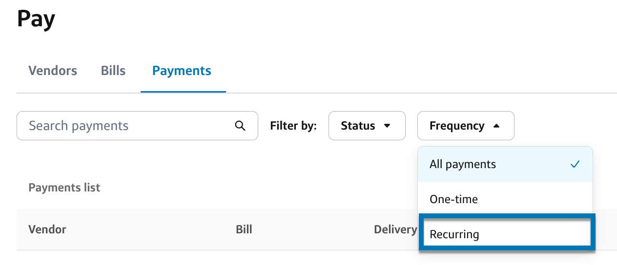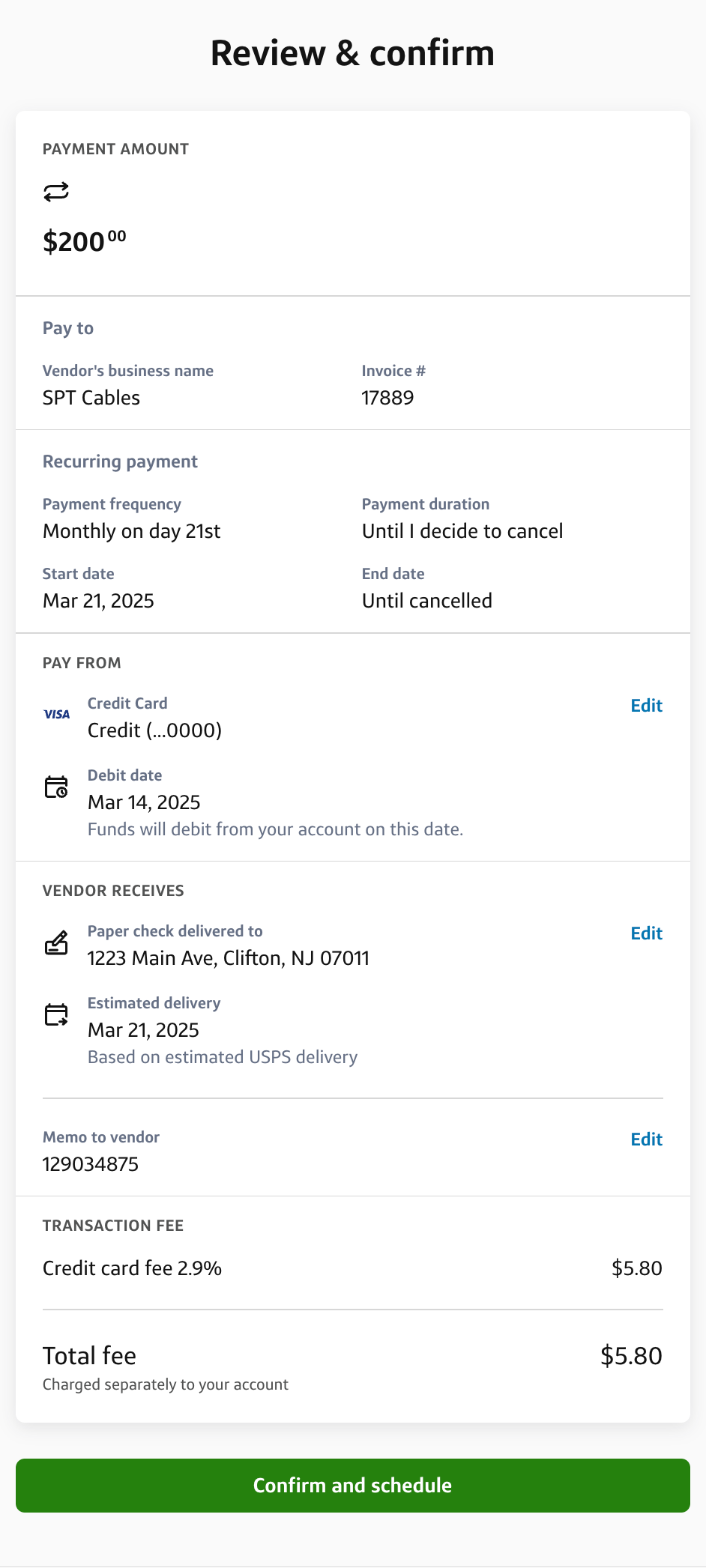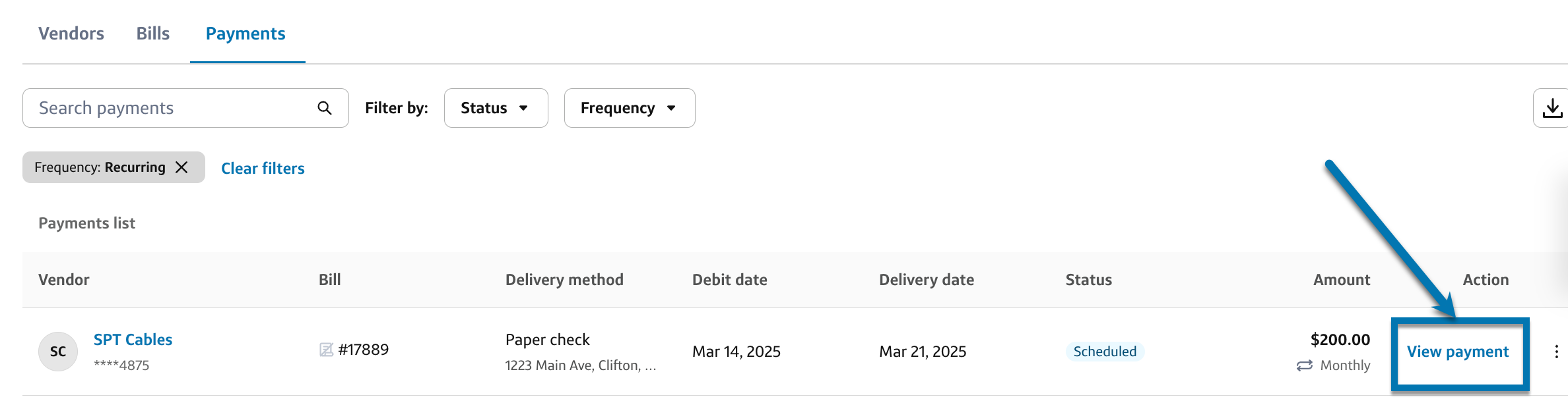 With pay business bills, you can set automatic payments to vendors you pay the same amount regularly. This ensures you never miss a payment and can help you stay organized.