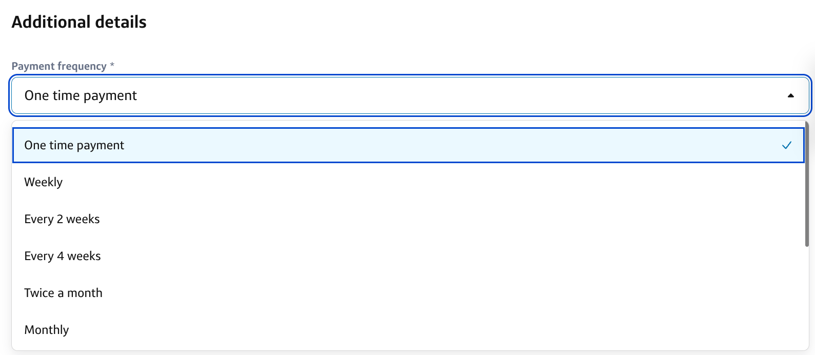 7- Next, set a recurring payment by adjusting the Payment frequency. Use the drop-down list to select the desired frequency.