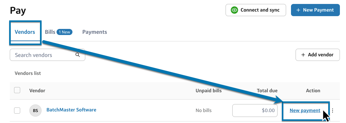 - In the Vendors tab, find the existing vendor you want to pay and select New Payment.