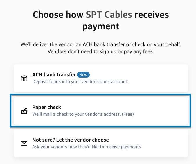 4—Next, select how your vendor receives the payment. Depending on which delivery method you select, you may be asked to enter the vendor's bank account details or mailing address.