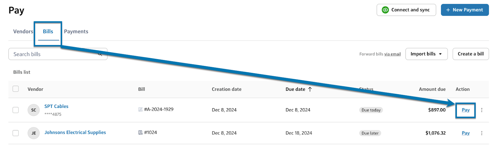 - You can select + New Payment from anywhere on the pay business bills dashboard.